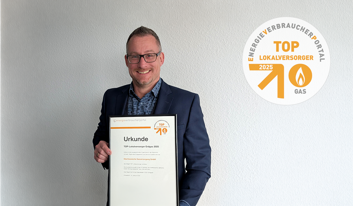Die Oberhessen-Gas wurde erneut als TOP-Lokalversorger in der Kategorie „Gas“ ausgezeichnet. Wie in den vergangenen Jahren überzeugte die Jury des unabhängigen Energieverbraucherportals auch für 2025 wieder das Gesamtpaket aus Preis, Transparenz, Vertragsgestaltung, persönlichem Kundenservice, regionalem Engagement für Umwelt- und Klimaschutz sowie die Unterstützung sozialer Einrichtungen vor Ort.